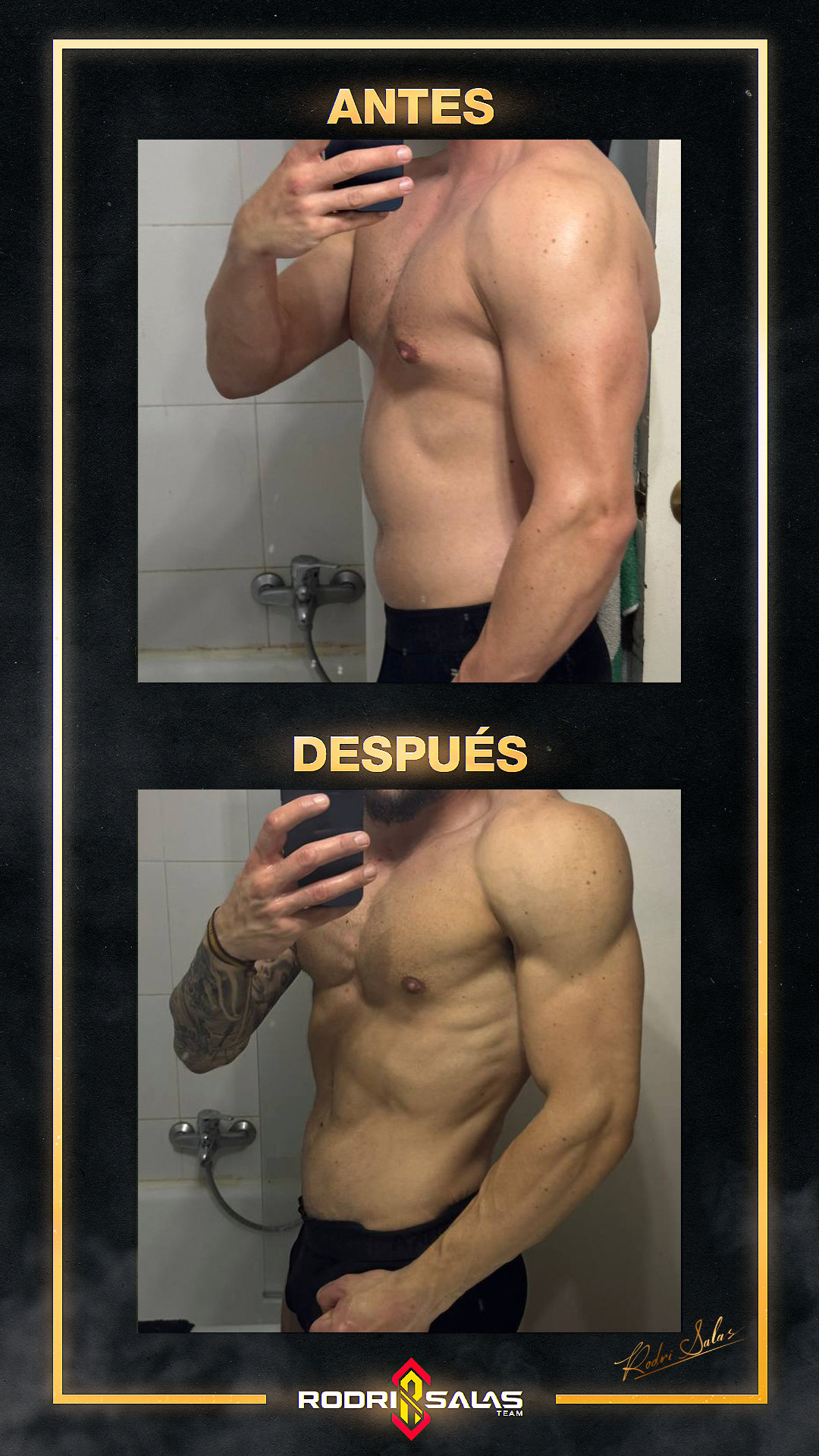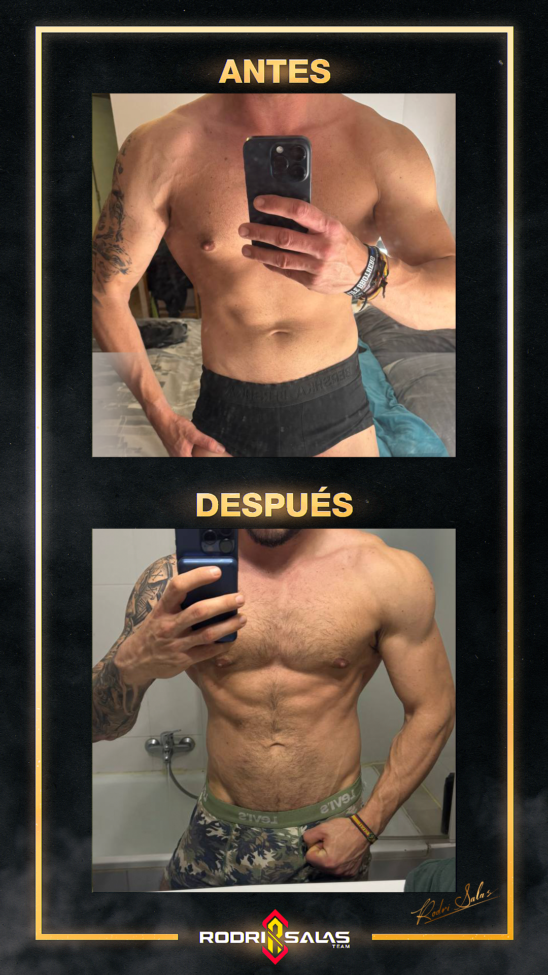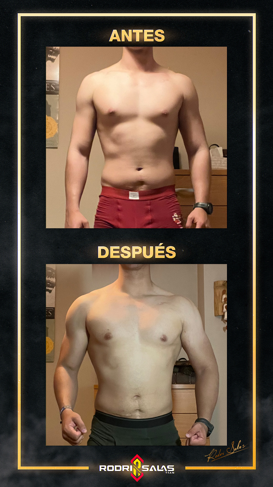 Aunque yo siempre he tenido desparpajo y he sabido hablar con las mujeres, no estaba a gusto con mi propio físico, y eso siempre se acaba transmitiendo de una u otra forma. Cuando contraté el programa, pesaba 61kg. Dos años después, puedes ver en la foto, peso 83. Parece que fue ayer cuando contraté y fue en 2021. Es increíble lo que se puede conseguir en dos años de trabajo guiado.