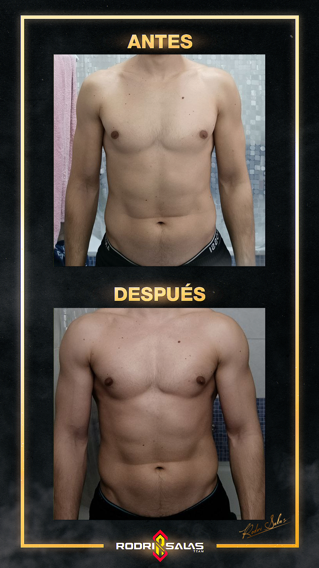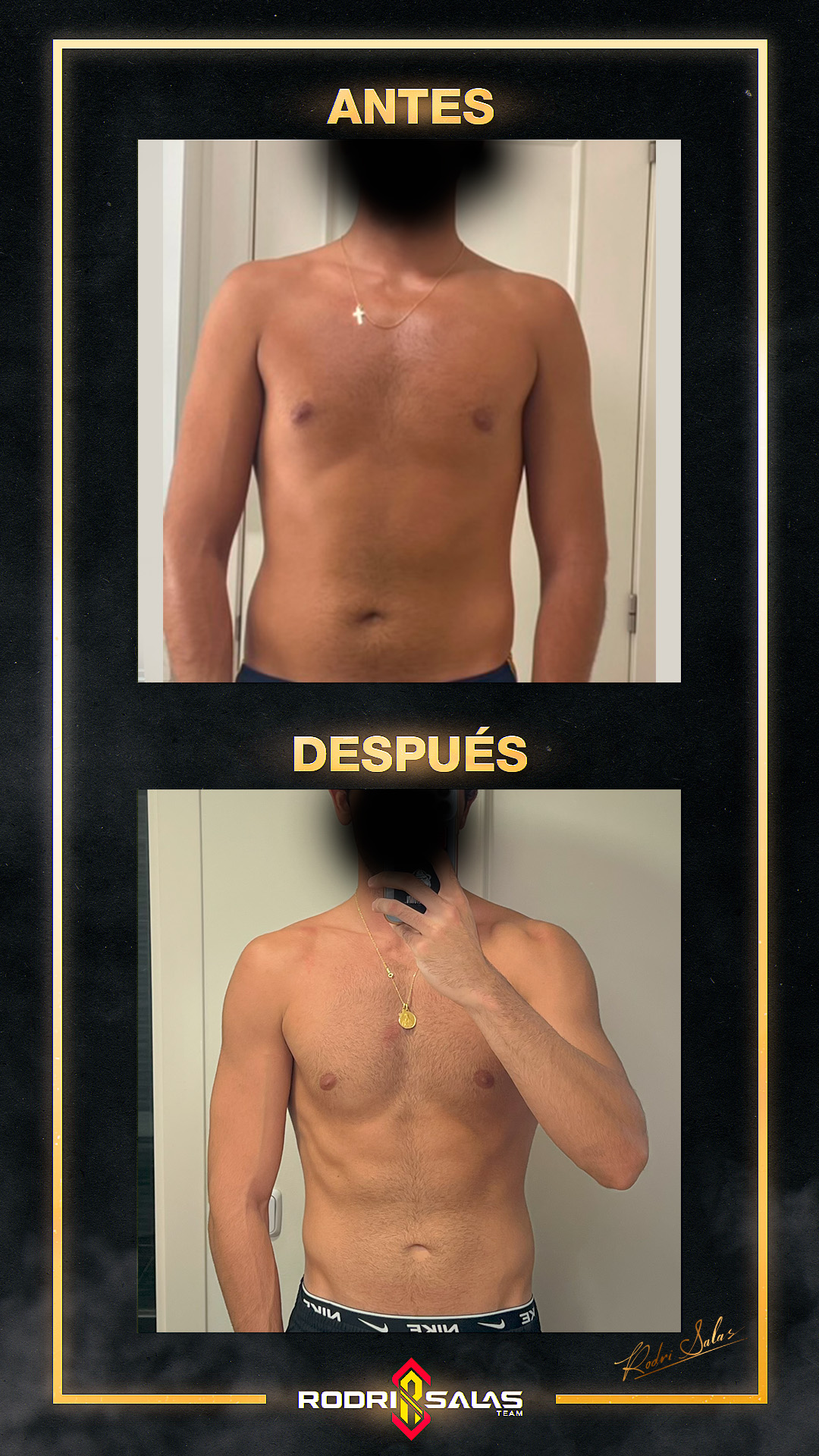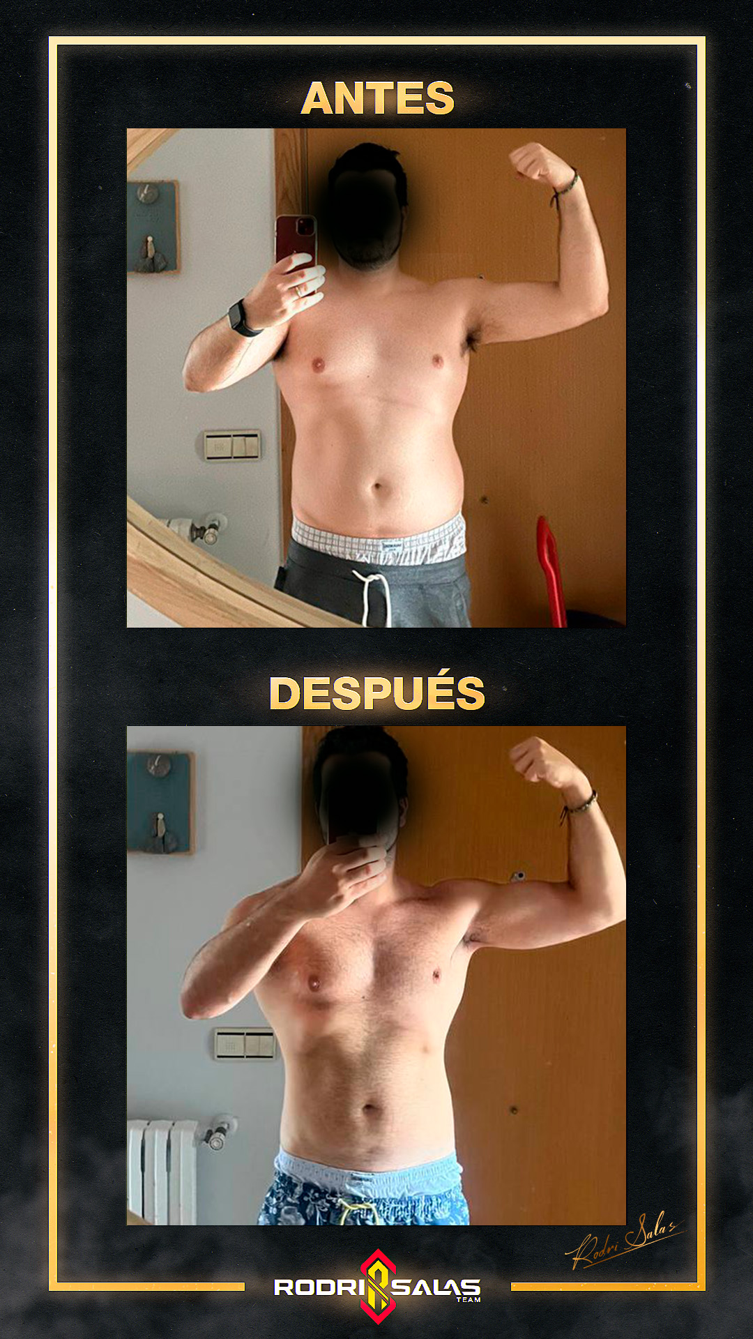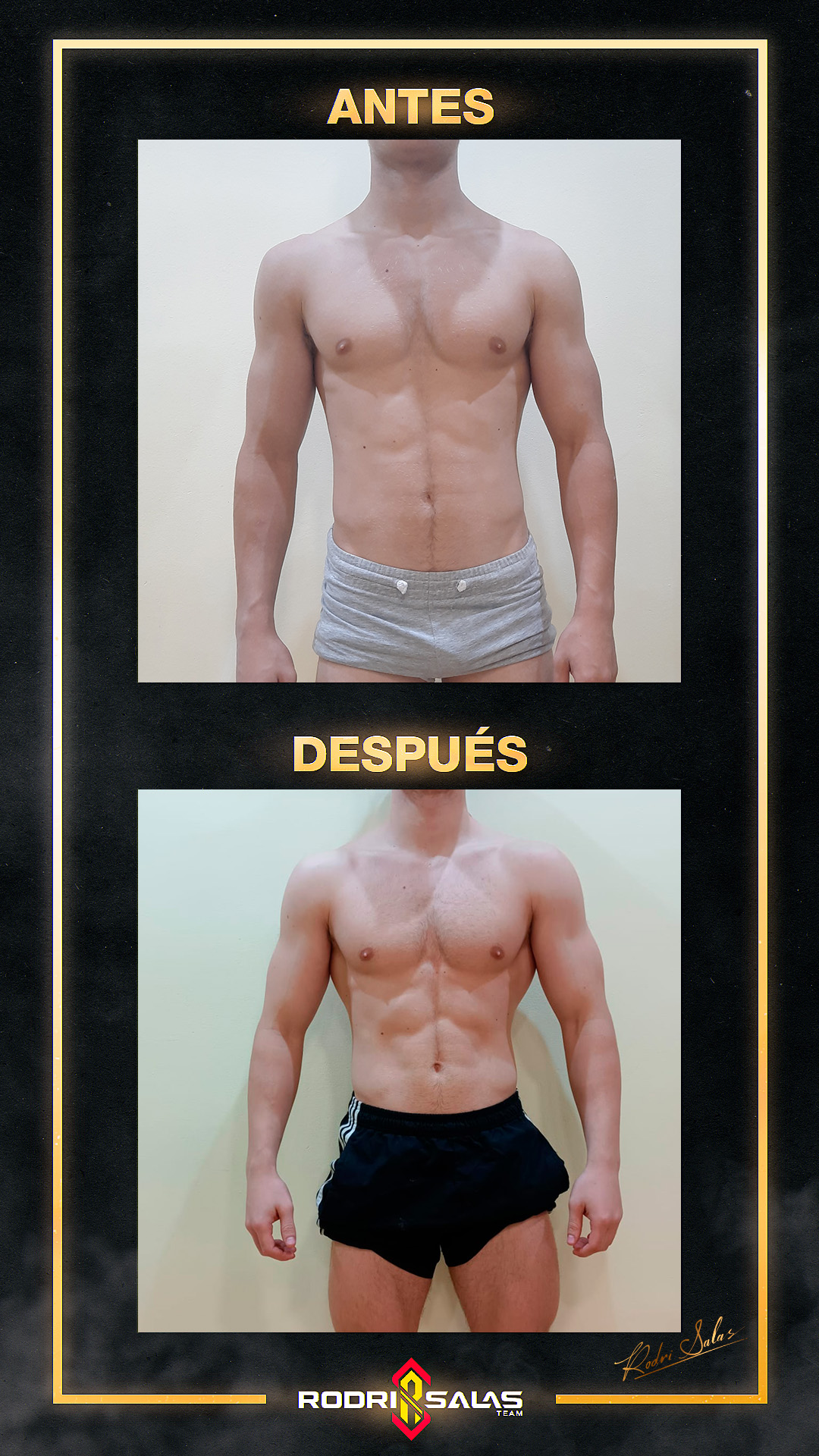 Aunque yo siempre he tenido desparpajo y he sabido hablar con las mujeres, no estaba a gusto con mi propio físico, y eso siempre se acaba transmitiendo de una u otra forma. Cuando contraté el programa, pesaba 61kg. Dos años después, puedes ver en la foto, peso 83. Parece que fue ayer cuando contraté y fue en 2021. Es increíble lo que se puede conseguir en dos años de trabajo guiado.